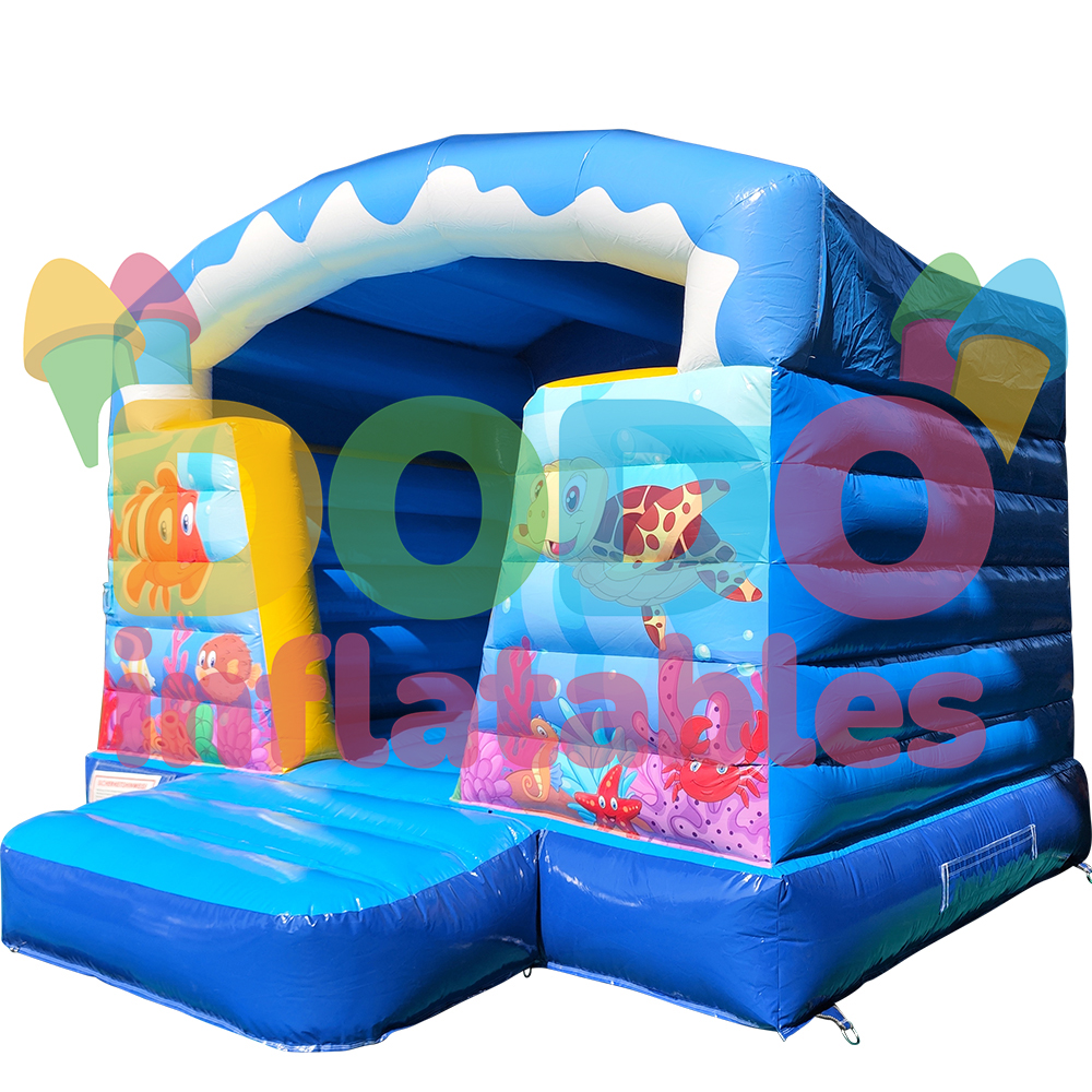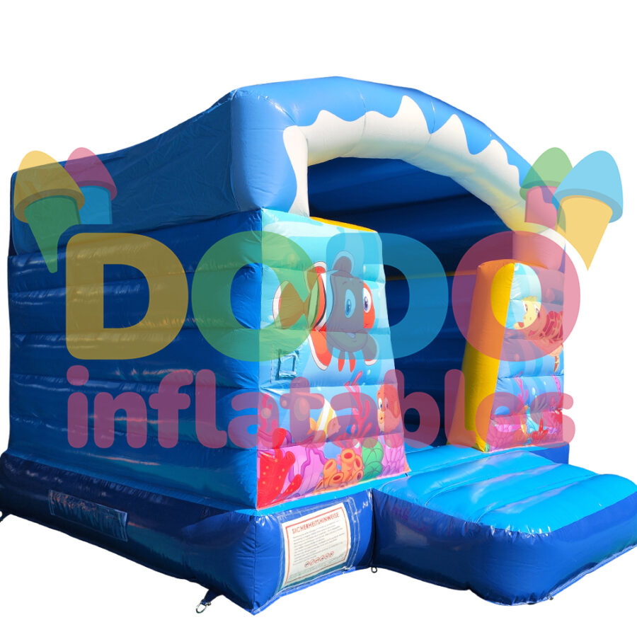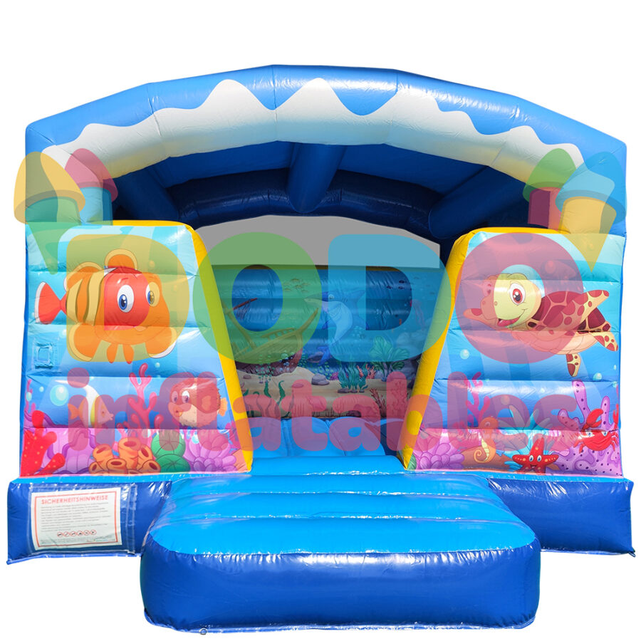 Hoppeborg “Havverden Mini” inviterer børnene til at opdage en fascinerende undervandsverden. Med detaljerede motiver af klovnefisk, skildpadder og et skibsvrag er der masser at udforske. Taget beskytter børnene mod stærk sol og let regn, og de lukkede vægge sikrer, at selv de yngste kan lege trygt. Takket være dens kompakte størrelse er denne hoppeborg en ideel attraktion til mindre haver og arrangementer.