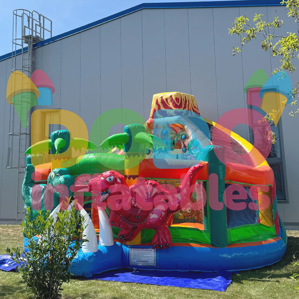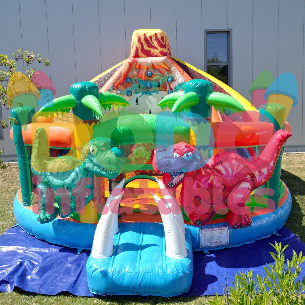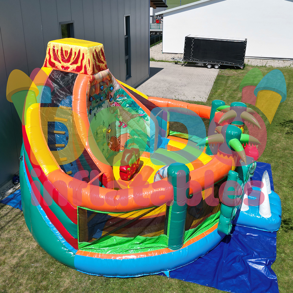 Laipni lūgti neaizmirstamā piedzīvojumā mūsu daudzspēļu vulkāna uzpūšamajā pilī ar dinozauriem! Šajā aizraujošajā lecamauklā apvienots vulkāna un dinozauru valdzinājums, lai piedāvātu bērniem ceļojumu aizvēsturiskajā pasaulē, kas ir pilna jautrības un iztēles. Mūsu Multiplay Vulkan piedāvā neskaitāmus aizraujošus uzdevumus, kas rotaļīgā veidā veicina fizisko mobilitāti un koordināciju. Slēgtās malas un drošības tīkls virs slīdkalniņa padara šūpuļdārzu ļoti drošu jebkurai lietošanai. Multiplay Volcano Bouncy Castle ar slīdkalniņu komplektā ir piemērota transportēšanas soma, un to var viegli uzstādīt aptuveni 10 minūtēs. Iepakojumā ietilpst uzpūšamā pils, transportēšanas soma un remonta komplekts. Lūdzu, ņemiet vērā, ka pūtējs un pamatnes pārklājs nav iekļauts komplektācijā. Tos var atrast mūsu piederumu kategorijā. Abi piedāvātie pūtēji(Huawei un Gibbons) ir piemēroti lecamauklai. Multiplay Volcano Bouncy Castle ar slīdkalniņu ir izgatavots no izturīga PVC brezenta (0,55 mm / 621,3 g/m2) un sertificēts atbilstoši DIN EN 14960, tāpēc tas ir kvalitatīvs produkts, kas atbilst visaugstākajiem drošības standartiem. Lūdzu, izmantojiet šūpuļdārzu tikai uz piemērotas pamatnes, lai pasargātu to no asiem priekšmetiem uz zemes un nodiluma. Lai nodrošinātu maksimālu drošību, iesakām uzstādīt uzpūšamo pili uz zāliena un nostiprināt to ar mūsu zemes enkuriem. Pēc katras lietošanas reizes lecamauklu jāizžāvē un pienācīgi jāiepako, lai pasargātu to no ārējās ietekmes un transporta bojājumiem.