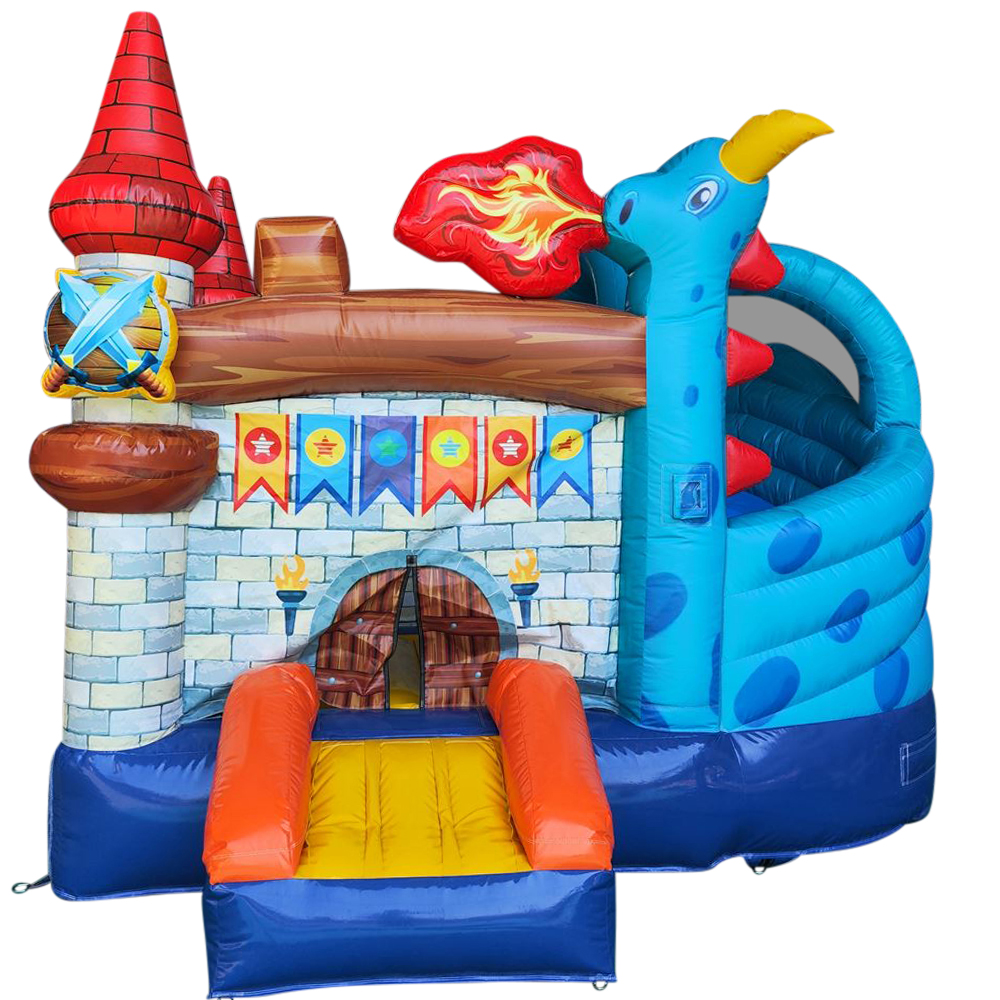 De betoverende Springkussen Glijbaan “Drakenland” neemt kleine avonturiers mee naar een wereld vol kleurrijke draken en magische landschappen. De springkussen is versierd met prachtige drakenmotieven die een unieke sfeer creëren. Boven de glijbaan zweeft een vriendelijke drakenkop die de kinderen uitnodigt om te glijden. De combinatie van de speelse drakenwereld en de spannende glijbaan maakt deze springkussen tot een onvergetelijke ervaring voor kleine avonturiers. De veiligheid staat voorop: de springkussen is uitgerust met een stevig dak boven de glijbaan en veiligheidsnetten bij alle openingen. Dankzij het compacte formaat past de Springkussen Drakenland ook perfect in kleinere tuinen.