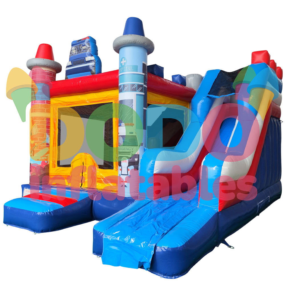 In the “Blue Light Heroes with Slide” bouncy castle, kids can jump and slide to their heart’s content. Perfect for young aspiring police officers, this bouncy castle combines jumping, climbing, and sliding for endless fun. The extra-long side slide and enclosed walls with safety nets make it a secure and exciting play environment for all little heroes.