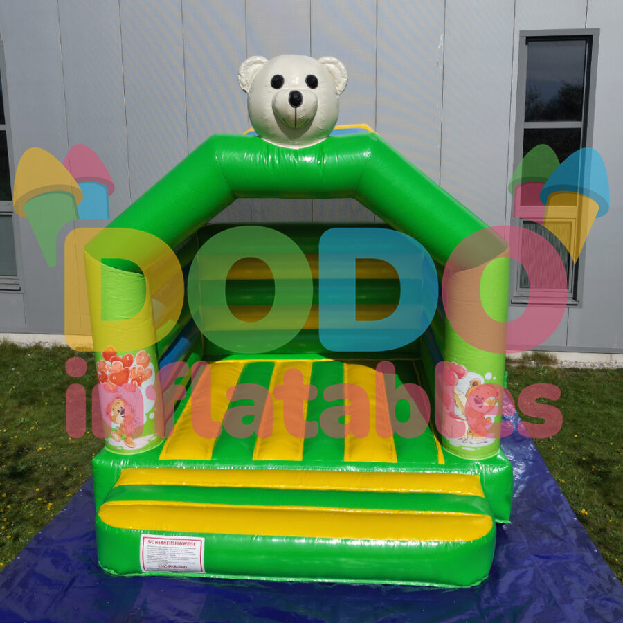 Napihljiv grad Medvedek je ljubek raj za male pustolovce! Prisrčen medvedji obraz na vrhu in simpatični motivi medvedkov z baloni ustvarjajo čarobno vzdušje. Napihljiv grad ponuja varno in veselo igralno okolje za neskončno zabavo in skakanje. Primeren je za otroške rojstne dneve, družinske prireditve in druge dogodke, kjer bo zagotovo očaral male obiskovalce. Streha ščiti otroke pred močnim soncem ali rahlim dežjem, zadnja varnostna mreža pa popolnoma zapira notranjost igrala in zagotavlja dodatno varnost.